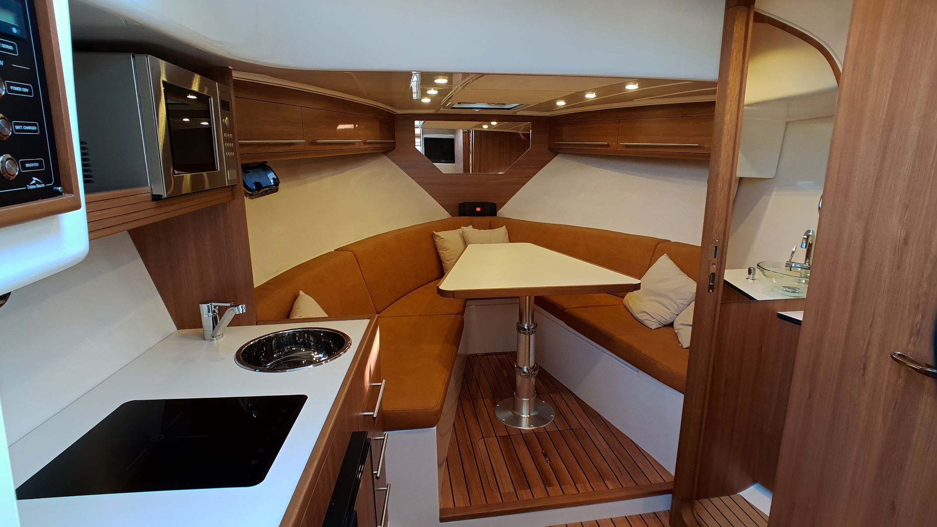 Dizajn interijera nije tipičan za ovaj tip plovila, zbog visine broda koju osigurava ravna paluba. Visina stajanja u salonu/kuhinji i posebno u kupaonici veća je od 1,9m.