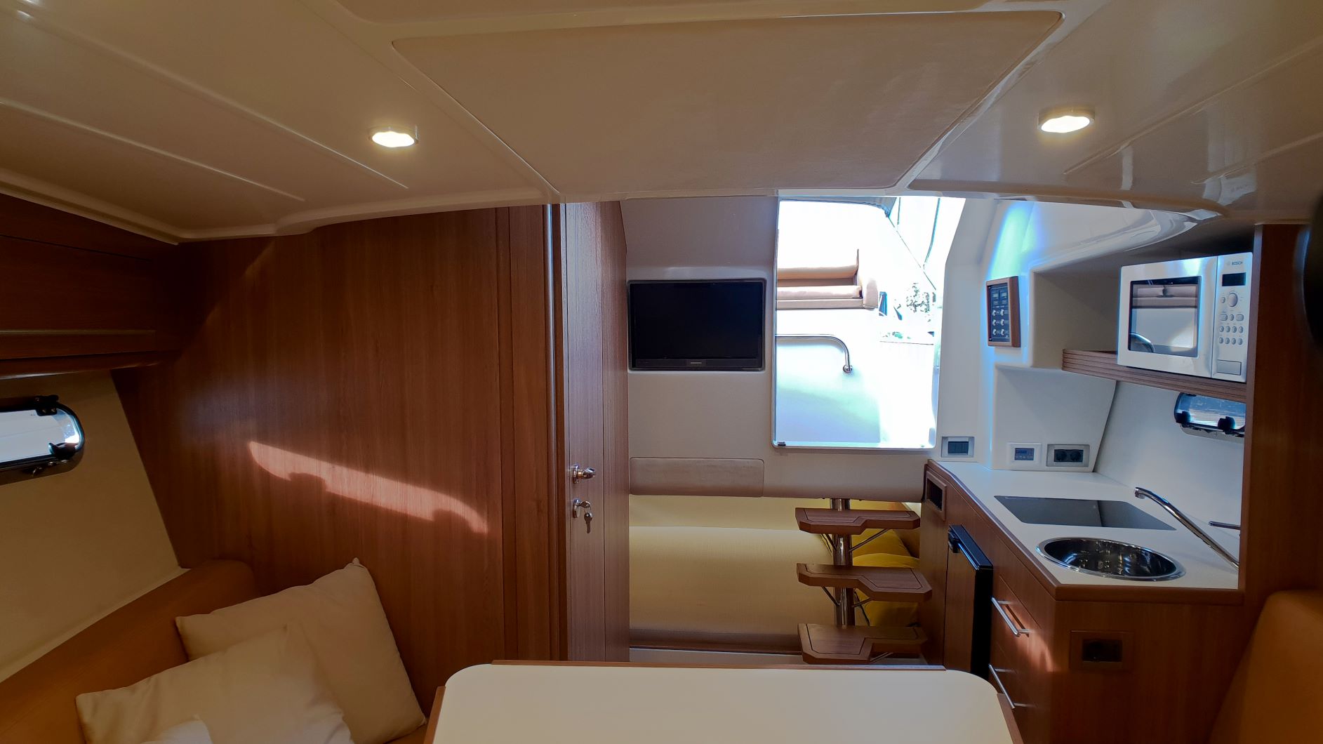 U salonu se nalazi klupa u obliku slova U sa velikim stolom u sredini sa sjedištem za šest osoba. Spuštanjem stola dobivamo veliki krevet za 2 ili 3 osobe + prostor za spavanje za 2 osobe koji se nalazi u stražnjem dijelu broda.