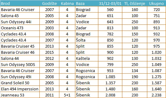 Cijene u ponudi su izražene u Eurima. Za plaćanje u Kunama se obračunava prema srednjem tečaju HNBa na dan uplate.Transit log i završno čišćenje se plaćaju prilikom dolaska na plovilo osoblju charter baze. Osim toga, potrebno je platiti boravišnu pristojbu 7 kuna/po danu/po osobi, prijavu za regatu. Sigurnosni depozit se može se položiti u slipovima kreditnih kartica ili u gotovini.
