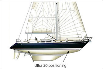 Ako Vam je vodena linija između 10 m i 20 m, odabrat ćete sustav Ultra 20 s dva ultrazvučna pretvarača. Primjenjuju se ista pravila, ali dodatni ultrazvučni pretvarač treba postaviti približno na trećinu puta od pramca broda prema unatrag. To će omogućiti da prednji dio trupa i eventualni pramčani propeleri ili dodatni podvodni propeleri ostanu čisti. Gdje treba postaviti ultrazvučne pretvarače vidljivo je i iz prikaza.