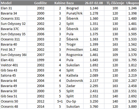Cijene u ponudi su izražene u eurima. Plaćanje u kunama obračunava se prema srednjem tečaju HNB-a ndan uplate. Transit log i završno čišćenje plaćaju se prilikom dolaska na plovilo osoblju charter baze. Osim toga, potrebno je platiti boravišnu pristojbu 7 kuna/po danu/po osobi. Sigurnosni depozit može se položiti u slipovima kreditnih kartica ili u gotovini.