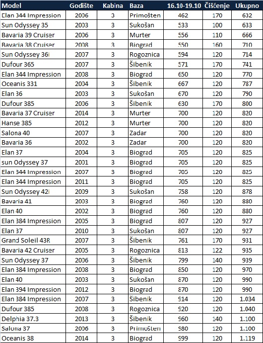 Cijene u ponudi su izražene u eurima. Plaćanje u kunama obračunava se prema srednjem tečaju HNB-a na dan uplate. Transit log i završno čišćenje plaćaju se prilikom dolaska na plovilo osoblju charter baze. Osim toga, potrebno je platiti boravišnu pristojbu 7 kuna/po danu/po osobi. Sigurnosni depozit može se položiti u slipovima kreditnih kartica ili u gotovini.
