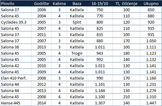 Cijene u ponudi su izražene u eurima. Plaćanje u kunama obračunava se prema srednjem tečaju HNB-a ndan uplate. Transit log i završno čišćenje plaćaju se prilikom dolaska na plovilo osoblju charter baze. Osim toga, potrebno je platiti boravišnu pristojbu 7 kuna/po danu/po osobi. Sigurnosni depozit može se položiti u slipovima kreditnih kartica ili u gotovini.