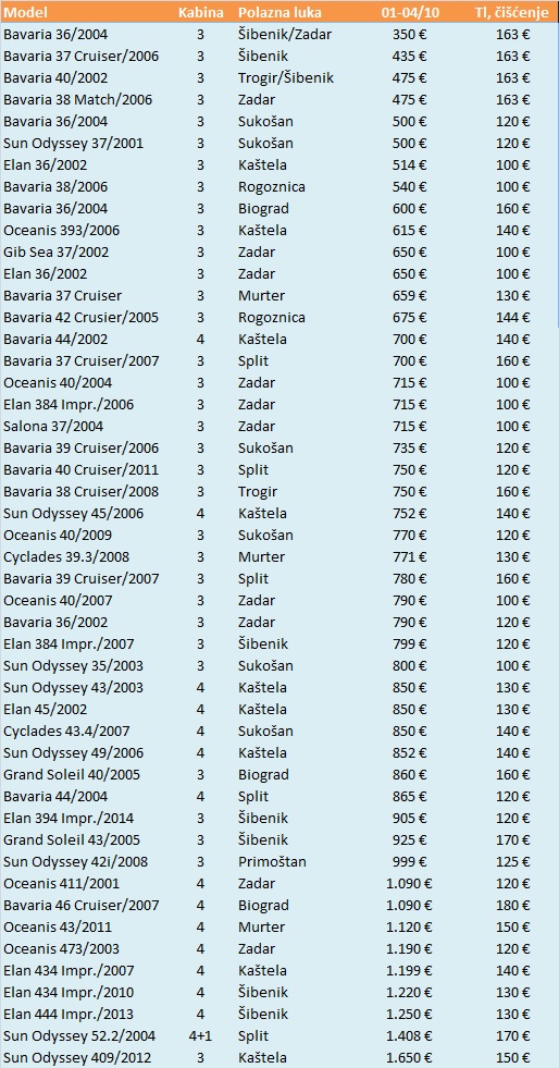 Ponuda charter jedrilica za produženi vikend srijeda ujutro-subota ujutro:
