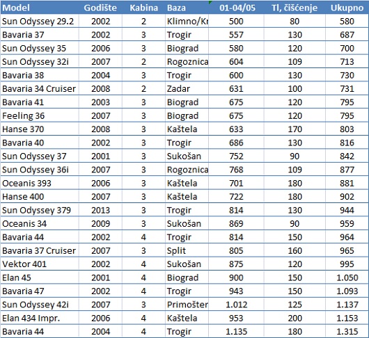 Cijene u ponudi izražene su u eurima. Plaćanje u kunama obračunava se prema srednjem tečaju HNB-a na dan uplate. Transit log i završno čišćenje se u većini slučaja plaćaju prilikom dolaska na plovilo osoblju charter baze. Osim toga, potrebno je platiti boravišnu pristojbu u visini od 7 kuna po danu po osobi. Sigurnosni depozit može se položiti u slipovima kreditnih kartica ili u gotovini.
