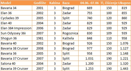 Jedrilice iz ponude:Bavaria 34, Elan 36, Cyclades 39, Elan 40, Elan 384 Impression, Sun Odyssey 36i, Shogun 36, Bavaria 40, Bavaria 38 Cruiser, Bavaria 36, Bavaria 37 Cruiser, Salona 40, Bavaria 39 Cruiser