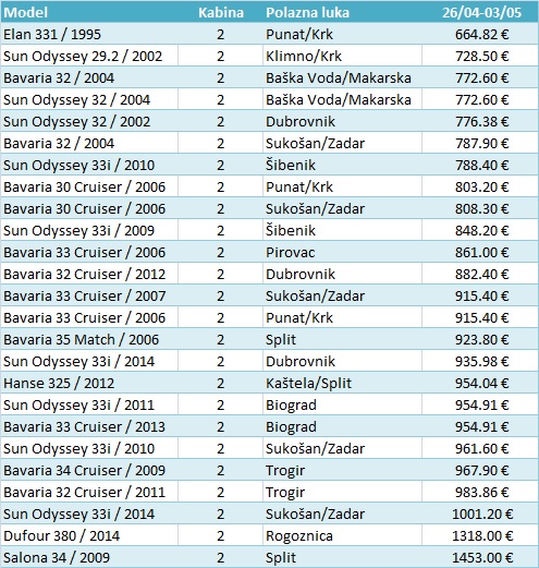 Prvomajski praznici su često prilika za prvi boravak na plovilu u toj godini. Prenosimo izbor iz ponude charter jedrilica s dvije kabine. Popust za ranu rezervaciju je uključen.