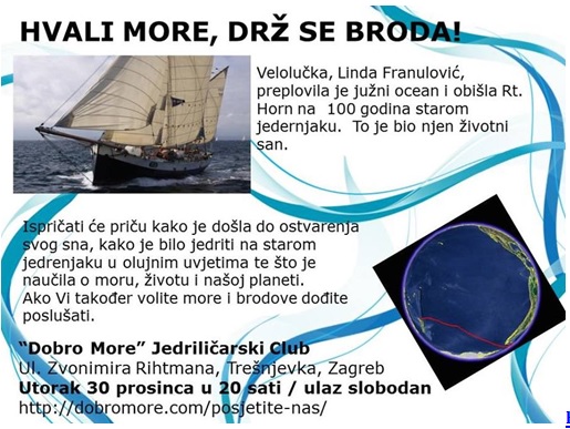 Velolučanka Linda Franulović preplovila je Južni ocean i obišla Rt. Horn na 100 godina starom jedernjaku. To je bio njen životni san. Linda će nam ispričati priču kako je došlo do ostvarenja njenog sna, kako je bilo jedriti na starom jedrenjaku u olujnim uvjetima te što je naučila o moru, životu i našoj planeti.