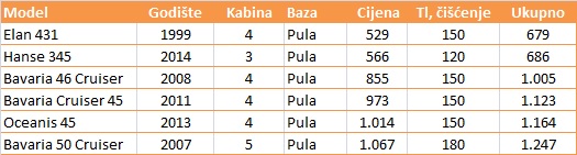 Modeli brodova iz ponude: Elan 431, Hanse 345, Bavaria 46 Cruiser, Bavaria Cruiser 45, Oceanis 45, Bavaria 50 Cruiser