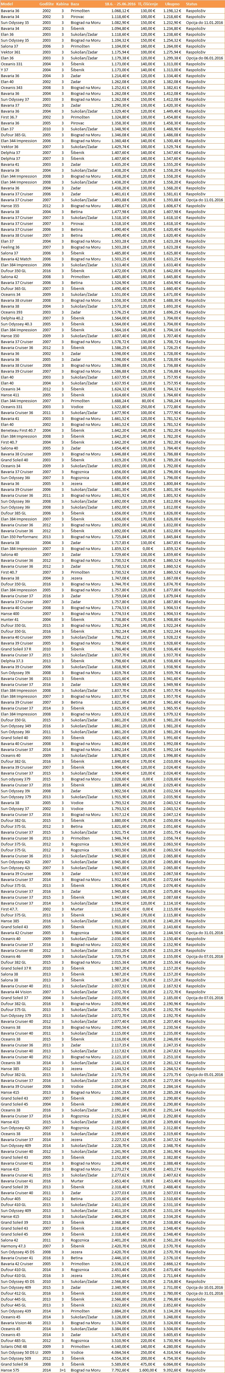 Od novijih brodova (2014-2016) poredak po modelima i najpovoljnijoj cijeni je sljedeći: Dufour 350 iz Šibenika (1.642,00 €), Bavaria Cruiser 37 Zadar (1.879,04 €), Sun Odyssey 349 Sukošan (1,981,20 €), Duforu 382 Šibenik (2.010,00 €), Sun Odyssey 379 Biograd (2,028,60 €), Hanse 385 (2,140,20 €), Oceanis 38 (2.230,56 €), Hanse 415 Sukošan (2.309,60 €), Sun Odyssey 409 Sukošan (2.348,20 €), Bavaria Cruiser 41 (2.388,49 €), Duforu 410 Sukošan (2.531,10 €).