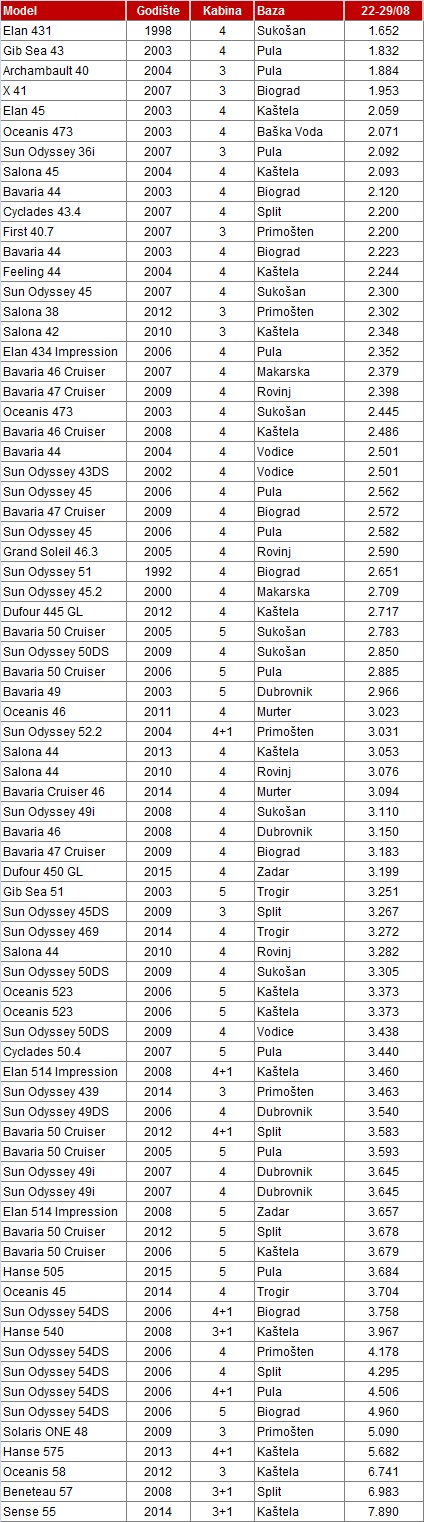 U zadnjem tjednu kolovoza jedrilica s dvije kabine gotovo da i nema ponudi. Nudi se jedan lijepi Sun Odyssey 42DS koji zbog paprene cijene i nije u ponudi. Od jedrilica s 3 kabine interesantno je da su najpovoljniji izraziti prerformance modeli X-41, Archambault 40, First 40.7, dvije Salone što znači da je potražnja za manjim brodovima za ovaj termin bila velika i da su gotovo svi brodovi iznajmljeni. Vjerujem da bi i za ovaj jedini cruiser model Sun Odyssey 36i iz Pule mogli još spustiti cijenu u odnosu na ovu službenu ponudu.