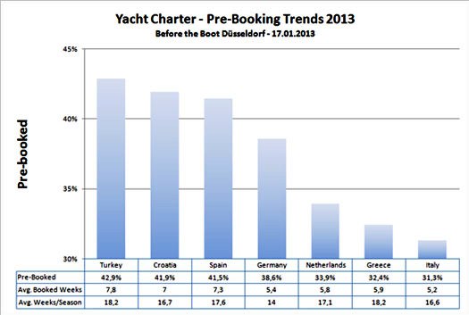 Rezultati po destinacijama dobiveni su analitičkim izračunom prema podacima iz Yachtbooker sustava. Za svaku charter destinaciju utvrdili su prosječnu količinu bookiranih tjedana po charter plovilu tijekom zadnjih dviju godina. Dok u njemačkim odredištima 14 tjedana već znači veliku popunjenost, u Turskoj čarter plovila trebaju biti iznajmljena oko 18 tjedana po sezoni.