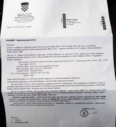 - Možda onaj tko je kupio brod nije prijavio na sebe, ne znam tko je to bio, nemam koga ni pitati. Deset godina nama nikakvi računi nisu stizali. A pogledajte sad ovu opomenu... - pokazuje nam Lea, pa čitamo skupa bizarni ulomak naslovljen za nekoga koga - ponavljamo - nema, za nešto čega nema. - Ako do 19. siječnja 2018. godine predmetno dugovanje ne bude podmireno tako da se obavi uplata prema dolje navedenim podacima za plaćanje, pokrenut ćemo ovršni postupak koji će obvezniku plaćanja prouzročiti dodatne troškove i neugodnosti - stoji u istaknutom dijelu dopisa. Lea je uporno zivkala onaj broj s uplatnice, veza je često, kaže, zauzeta, a kad se konačno netko javio, kazali su joj da se ne brine jer nije jedina koja zbog toga zove.