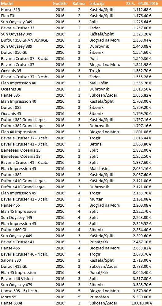 Hanse 315, Elan E3; Sun Odyssey 349; Bavaria Cruiser 33; Dufour 350 GRANDLARGE; Sun Odyssey 389; Bavaria Cruiser 37; Oceanis 35; Elan Impression 40; Oceanis 38; Hanse 385; Dufour 382;, Oceanis 45; Bavaria Cruiser 41; Elan Impression 45; Dufour 410 Grand Large; Hanse 455; Sun Odyssey 449; Dufour 460 GL; Bavaria Cruiser 46 ; Salona 380; Dufour 412 GL; Bavaria 46 Vision; Sun Odyssey 479; Hanse 505; More 55; Hanse 630e