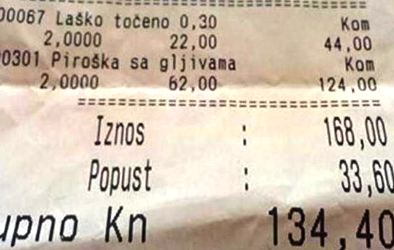 Naime, kako je kazala, njezin suprug i prijatelj otišli su u Olivu na piroške i pivo. Kada su dobili račun na 168 kuna, koji je s popustom od 20 posto iznosio 134,60 kuna, doista su se iznenadili.