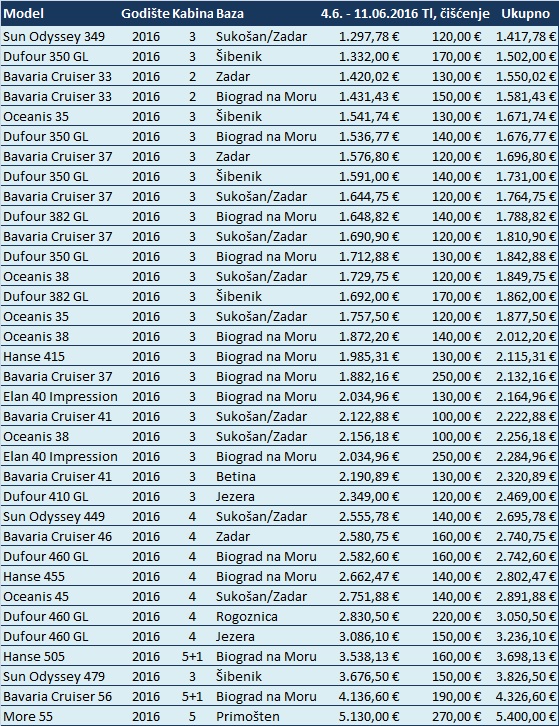 U akvatoriju Kornata u sezoni 2016. mogu se unajmiti sljedeći novi modeli jedrilica: