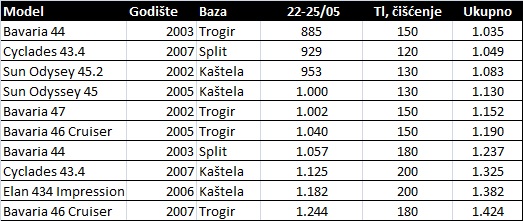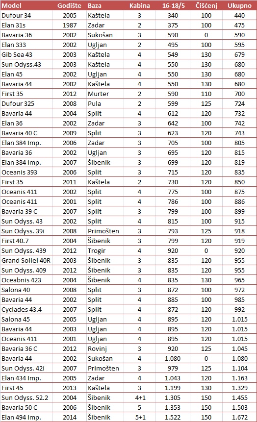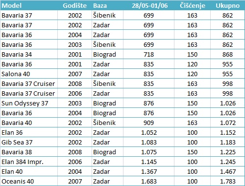 Cijene u ponudi su izražene u eurima. Plaćanje u kunama obračunava se prema srednjem tečaju HNB-a na dan uplate. Transit log i završno čišćenje se u većini slučajeva plaća prilikom preuzimanja plovila osoblju charter baze. Osim toga, potrebno je platiti boravišnu pristojbu 7 kuna/po danu/po osobi. Sigurnosni depozit može se položiti u slipovima kreditnih kartica ili u gotovini.