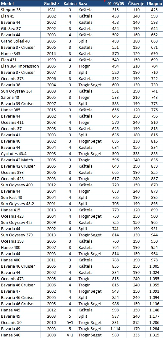 Bavaria 37 Cruiser, Bavaria 38, Bavaria 39 Cruiser, Bavaria 40, Bavaria 41, Bavaria 42 Cruiser, Bavaria 42 Match, Bavaria 44, Bavaria 46 Cruiser, Bavaria 47, Bavaria 49, Cyclades 43.4, Elan 384 Impression, Elan 431, Elan 45, Gib Sea 37, Grand Soleil 40, Hanse 345, Hanse 385, Hanse 400, Hanse 415, Hanse 445, Hanse 540, Oceanis 37, Oceanis 373, Oceanis 393, Oceanis 411, Oceanis 423, Oceanis 423, Oceanis 473, Oceanis 50, Salona 40, Shogun 36, Sun Fast 43, Sun Odyssey 36i, Sun Odyssey 379, Sun Odyssey 409, Sun Odyssey 42i, Sun Odyssey 45.2