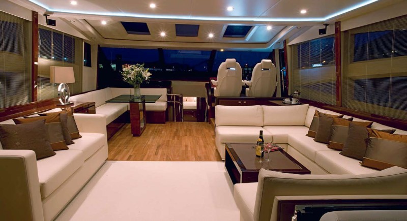Salon je vrlo dobro osvijetljen, baš kao i unutarnje upravljačko mjesto koje se na njega nadovezuje, opremljeno dvama naslonjačima vrhunske izrade, presvučenim bijelom kožom. Oba je naslonjača moguće namjestiti horizontalno, a kolo upravljača smješteno je zamjetno visoko. Kormilarsko je mjesto relativno usko, pa onima s viškom kilograma (odnosno centimetara oko trbuha) neće biti najudobnije - ali je zato stajaći položaj za upravljanje vrlo ugodan skiperima svih ‘dimenzija'.