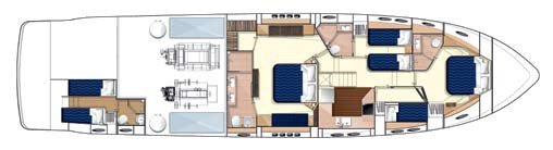 Dvije dvokrevetne gostinske kabine nalaze se prema pramcu; jedna ima krevete smještene jedan pored drugog, dok su u drugoj oni postavljeni na kat. VIP kabina je u samom pramcu, prostrana je i preplavljena prirodnom svjetlošću koja dopire kroz tri velika okna. Vlasnička je kabina doista velikih dimenzija i ima čak četiri okomita okna, a između ostalog je opremljena i toaletnim stolićem koji može poslužiti i kao radni stol, te naslonjačem velikih dimenzija koji se, po želji naručitelja, može zamijeniti ležaljkom. Ova kabina ima veliki bračni krevet iz čijeg podnožja izvire televizor, te privatnu kupaonicu s dva umivaonika i tuš-kabinom. Vlasnička kabina također ima i veliku garderobu, originalno osvijetljenu rasvjetnim tijelima instaliranim na vješalice za odjeću, a koja razdvaja kabinu od strojarnice i tako jamči savršenu izolaciju buke i vibracija. Što se posade tiče, njenim je članovima namijenjena dvokrevetna kabina s vlastitom kupaonicom, ali bez odvojene blagovaonice.