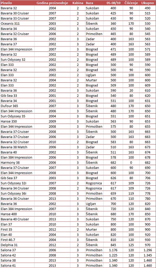Cijene u ponudi su izražene u Eurima. Za plaćanje u Kunama se obračunava prema srednjem tečaju HNBa na dan uplate.Transit log i završno čišćenje se plaćaju prilikom dolaska na plovilo osoblju charter baze. Osim toga, potrebno je platiti boravišnu pristojbu 7 kuna/po danu/po osobi. Sigurnosni depozit se može se položiti u slipovima kreditnih kartica ili u gotovini.
