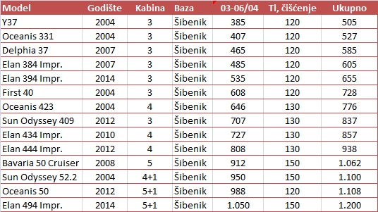 Modeli jedrilica iz ponude: Y37, Oceanis 331, Delphia 37, Elan 384 Impr., Elan 394 Impr., First 40, Oceanis 423, Sun Odyssey 409, Elan 434 Impr., Elan 444 Impr., Bavaria 50 Cruiser, Sun Odyssey 52.2, Oceanis 50, Elan 494 Impr.