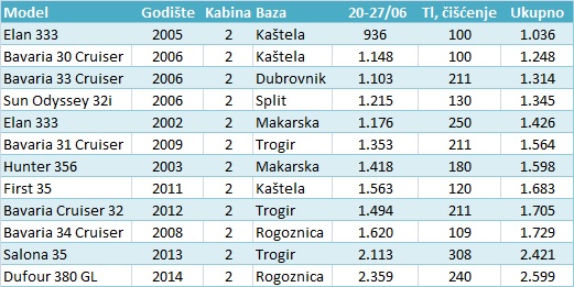 Modeli jedrilica iz ponude: Elan 333, Bavaria 30 Cruiser, Bavaria 33 Cruiser, Sun Odyssey 32i, Bavaria 31 Cruiser, Hunter 356, First 35, Bavaria Cruiser 32, Bavaria 34 Cruiser, Salona 35, Dufour 380 GL