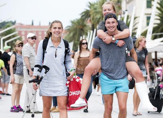 Englez Johnny u Split je došao sam prije četiri dana, u petak je ovdje upoznao Aline i Rosalie iz Belgije koje su tek stigle u naš grad, i rodilo se prijateljstvo. Jedna od djevojaka je u prvom noćnom izlasku na Bačvicama ozlijedila nogu, pa je kavalir Johnny na krkećima nosi preko Rive.