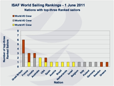 Svjetski jedriličarski savez objavio je nove ljestvice olimpijskih klasa, a prema broju natjecatelja plasiranih među prva tri Hrvatska je na diobi drugog mjesta! U deset olimpijskih disciplina Velika Britanija ima šest predstavnika među tri najbolja, Francuska i Hrvatska po tri, Australija i SAD po dva, te još 11 zemalja po jednog. Podsjećamo na regatama Svjetskog kupa ove godine nazočno je 60ak zemalja.