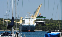 Dvije velike dizalice ispružile su se iznad mora da bi na kranovima, pomoću dva "balancina", postavile brage. Katamaran je potom inbragan pomoću 12 snažnih braga i počela je najdelikatnija operacija - dizanje broda iz more i ukrcaj na palubu. S druge strane teretnog broda izbačene su dizalice da bi teretni brod zadržao balans.