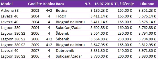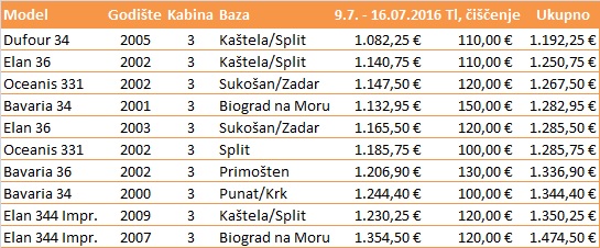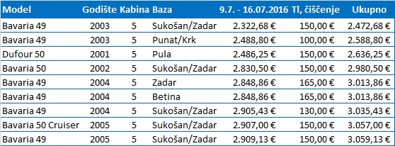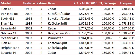 Odabrano je 10 brodova u 5 kategorija za termin 09-16/07/16 - ukupno 50 brodova.