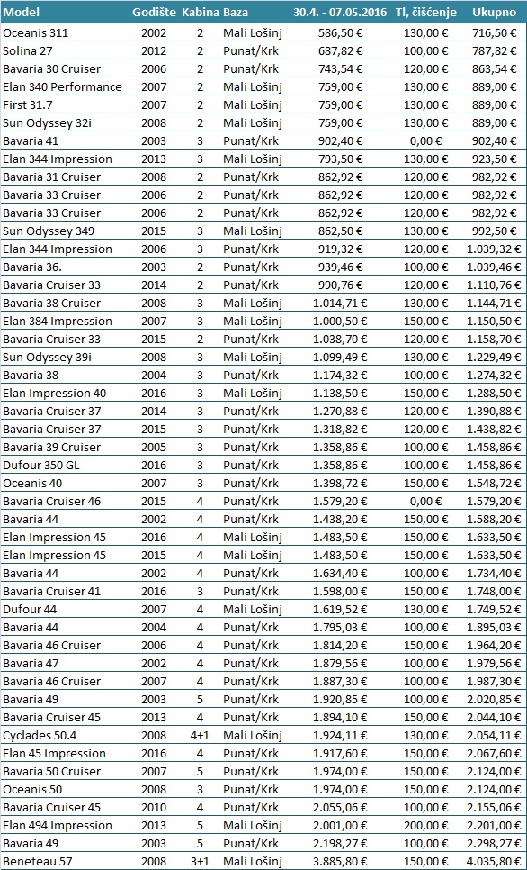 Cijene u ponudi su izražene u Eurima. Za plaćanje u kunama se obračunava prema srednjem tečaju HNBa na dan uplate.Transit log i završno čišćenje se plaćaju prilikom dolaska na plovilo osoblju charter baze. Osim toga, potrebno je platiti boravišnu pristojbu 7 kuna/po danu/po osobi, prijavu za regatu. Sigurnosni depozit se može se položiti u slipovima kreditnih kartica ili u gotovini.