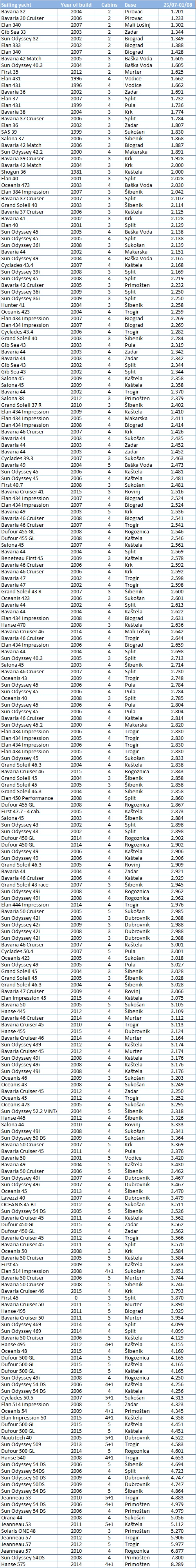 Ponuda oko 200 raspoloživih charter jedrilica za termin 25.07.-01.08.