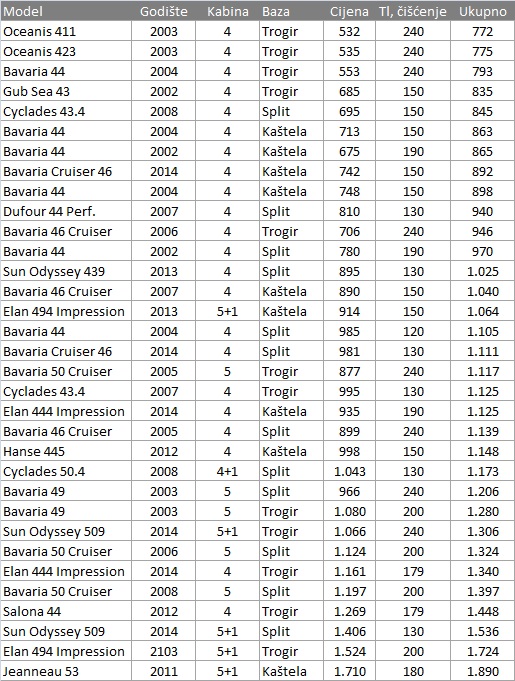 Cijene u ponudi su izražene u eurima. Plaćanje u kunama obračunava se prema srednjem tečaju HNB-a na dan uplate. Transit log i završno čišćenje plaćaju se prilikom dolaska na plovilo osoblju charter baze. Osim toga, potrebno je platiti boravišnu pristojbu 7 kuna/po danu/po osobi. Sigurnosni depozit može se položiti u slipovima kreditnih kartica ili u gotovini.