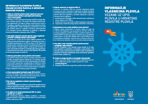 Na tim sastancima usuglašen je i pripremljen informativni letak koji sadrži detaljne korake, odnosno informacije o carinjenju i načinu registracije plovila u RH te dokumentaciji koju je potrebno prikupiti kako bi se mogao izvršiti upis plovila u hrvatske registre brodova.