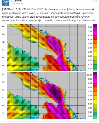 "Prognostički model AM&WFG predviđa maksimalnu visinu valova blizu deset metara. Ovakvo stanje mora izazvat će poremećaje u prometu morem, osobito u prvom dijelu utorka", napisali su na Facebooku.
