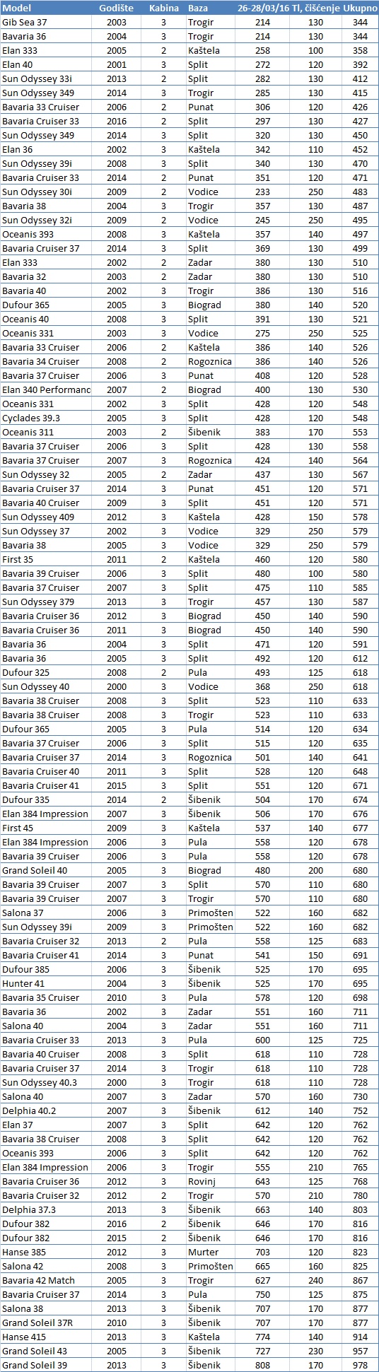 Macrocruise ponuda sadrži stotinjak charter plovila s 2 ili 3 kabine u terminu od 26-28/03 (subota-ponedjeljak).