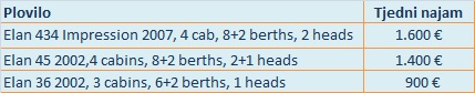 Tjedna cijena iz tablice uključuje najam plovila , fleksibilan check in i check out vremena (ne mora biti subota-subota), čišćenje , posteljinu ( jedan set po osobi ), ručnike ( dva po osobi ), vanbrodski motor, gorivo za vanbrodski motor i posebnu dobrodošlicu na brodu.